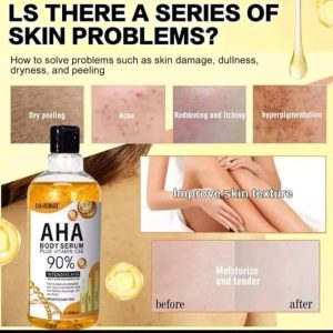 AHA، ویتامین C و E در کنار هم به کاهش لکهای تیره، رفع تیرگی بدن و یکنواختسازی رنگ پوست کمک میکنند.